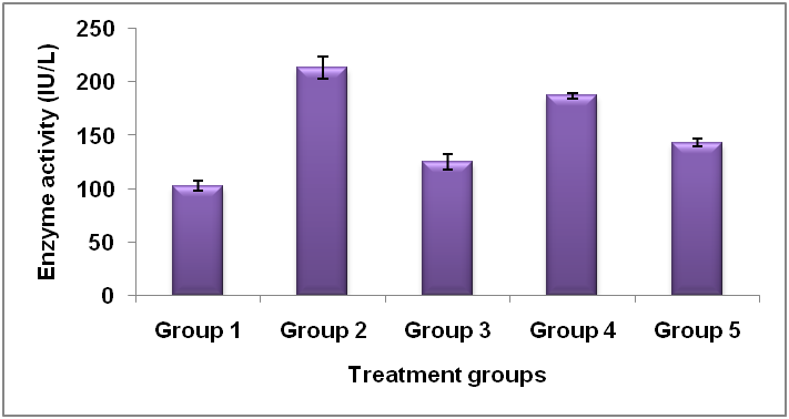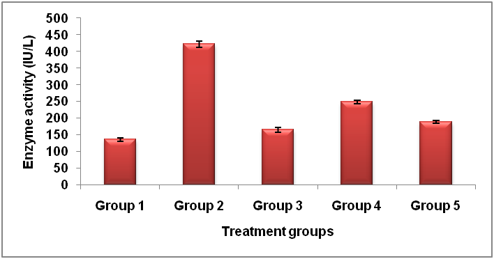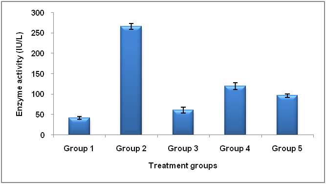 On 7th d, animals were sacrificed by cervical dislocation. The blood was collected by cardiac puncture of each animal and serum was separated, which was analyzed for assessment of enzyme activity. After collecting blood from each animal, the liver was separated, washed with ice-cold PBS and soaked in filter paper. Liver tissue was minced; added 5 ml ice-cold PBS and was homogenized in tissue homogenizer at 4000 rpm for 5 min and then centrifuged at 5000 rpm for 5 min. The clear supernatant was stored at 4 °C until use [16, 17].