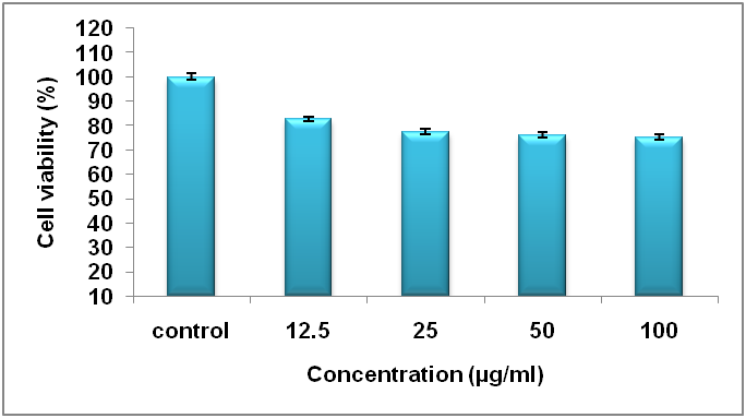 HepG2 hepatic carcinoma cells were trypsinized (500 µl of 0.025% Trypsin in PBS/0.5 mmol EDTA solution) for 2 min and transferred to T flasks in complete aseptic conditions. 200 µl of the cell suspension was plated into a 96-well culture plate and incubated for 24 h. Post incubation, the cells were treated with different fractions of ESBE at a concentration ranging from (12.5–100 μg ml-1) for 24 h, to investigate the possible toxic effect. MTT assay was employed to measure cell viability. Later, for studying the hepatoprotective activity, cells were pretreated with different fractions of ESBE and incubated for 2 h. Then CCl4 (0.1%) was added to the wells and kept for 24 h. Untreated cells were kept as control. Thereafter, the viability of HepG2 cells was estimated by MTT reduction assay [20].
