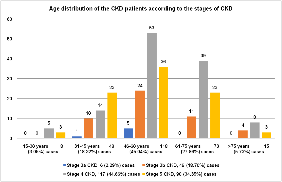 Fig. 1 shows 45.04 % (118) of the patients were between 46 and 60 y of age, followed by 27.86 % (73) of the patients were between 61 and 75 y of age; the majority (66.41%) being below 60 y age group. 79.01% (207 cases) of the patients in our study group belong to stage 4 and stage 5 chronic kidney diseases. All the cases in 15-30 y of age group are severe CKD (stage 4 and 5).