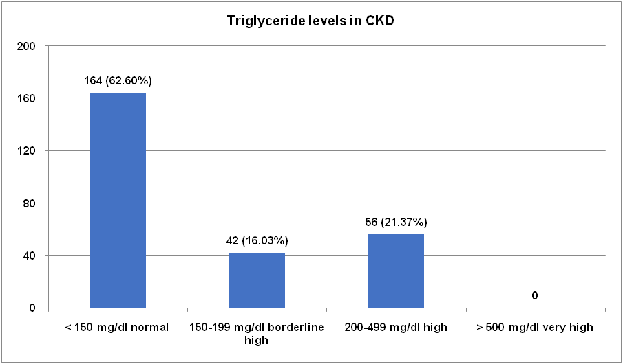 In our study, we had 19.61% of CKD cases with hypercholesterolemia. Ganta et al. [23], Saroj K et al. [28] and Anderson et al. [29] found 22.86%, 34.4%, 20% of CKD cases with hypercholesterolemia in their study respectively. In our study population, there is a marked elevation of triglycerides in 37.40% of patients. A study by Saroj K et al. reported a prevalence of 36.6% of hypertriglyceridemia in CKD [28]. 21.37% of the study group was having HDL level below 40 mg/dl. Similarly, Ganta et al. [23] study found a decreased level of HDL in 21.43% of cases with CKD. 11.07% of our study group population had an increased level of LDL. Poudel et al. reported an undesirable level of LDL in 38.03% of cases [30]. The LDL cholesterol is abnormal in only 12.86% of the study population in Ganta et al. [23] study, which is very similar to our study.