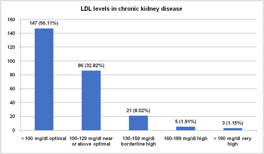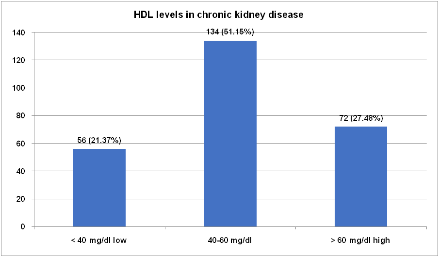 Conclusion: The prevalence of dyslipidemia in non-diabetic CKD is high. A high degree of abnormality is found in HDL with disease progression, which is statistically significant. Therefore, maintenance of desired lipid levels either through diet or early initiation of lipid-lowering drugs can be helpful in decreasing the risk of cardiovascular complications in CKD patients.