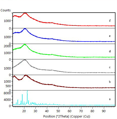 Fig. 1: X-ray diffraction pattern for a) pure ketoprofen, b) PVP K-30, c) solid dispersion of ketoprofen-PVP K-30 at ratio 1:1, d) solid dispersion of ketoprofen-PVP K-30 at ratio 1:3, e) solid dispersion of ketoprofen-PVP K-30 at ratio 1:5 and f) solid dispersion of ketoprofen-PVP K-30 at ratio 1:9