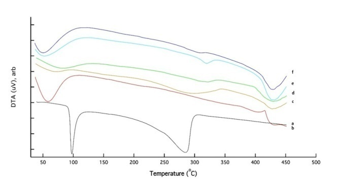 Fig. 2: DTA thermogram for: a) pure ketoprofen, b) PVP K-30, c) solid dispersion of ketoprofen-PVP K-30 at ratio 1:1, d) solid dispersion of ketoprofen-PVP K-30 at ratio 1:3, e) solid dispersion of ketoprofen-PVP K-30 at ratio 1:5 and f) solid dispersion of ketoprofen-PVP K-30 at ratio 1:9