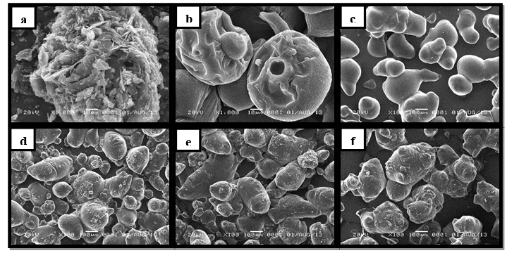 Fig. 3: SEM microphoto for a) intact ketoprofen, b) PVP K-30, c) solid dispersion of ketoprofen-PVP K-30 at ratio 1:1, d) solid dispersion of ketoprofen-PVP K-30 at ratio 1:3, e) solid dispersion of ketoprofen-PVP K-30 at ratio 1:5 and f) solid dispersion of ketoprofen-PVP K-30 at ratio 1:9