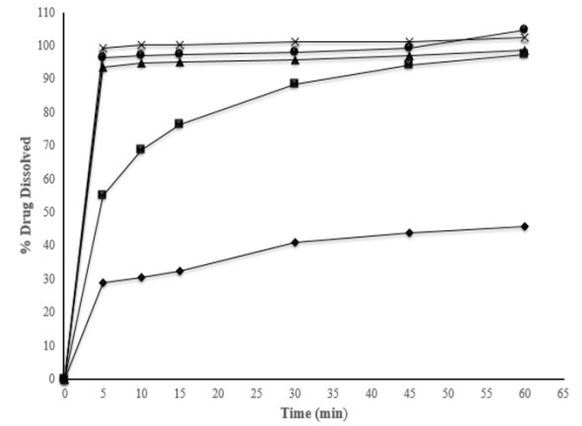 An amorphous solid drug is in a higher thermodynamic energy state compared to its crystalline state. Due to higher molecular mobility within the system, amorphous solid has a greater solubility and dissolution rate. However, the use of amorphous state gives rise to physical and chemical reactivity problems, which can tend to transform to the thermodynamic stable crystalline form and degrade faster than the stable form during the manufacturing process and storage conditions [11]. Some water soluble polymers such as PVP K-30, HPMC, and PEG 6000 can inhibit the phase transformation through intermolecular interaction. Consequently, molecular mobility is lowered, so that the solid remains in its amorphous state.