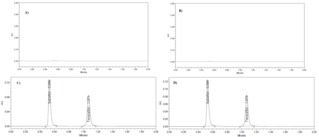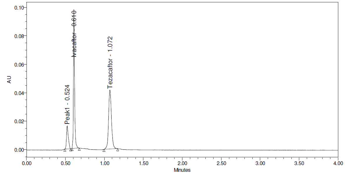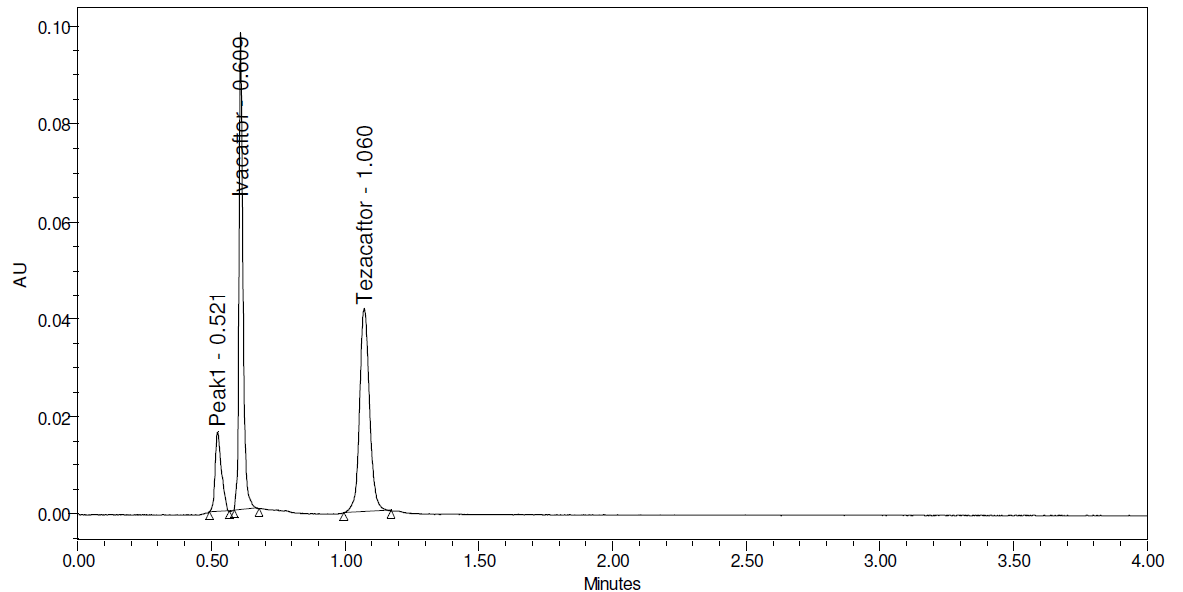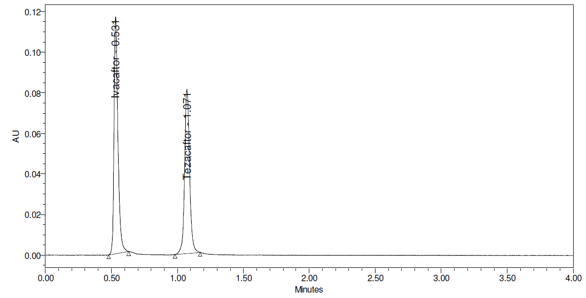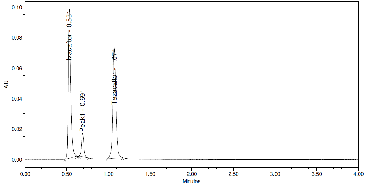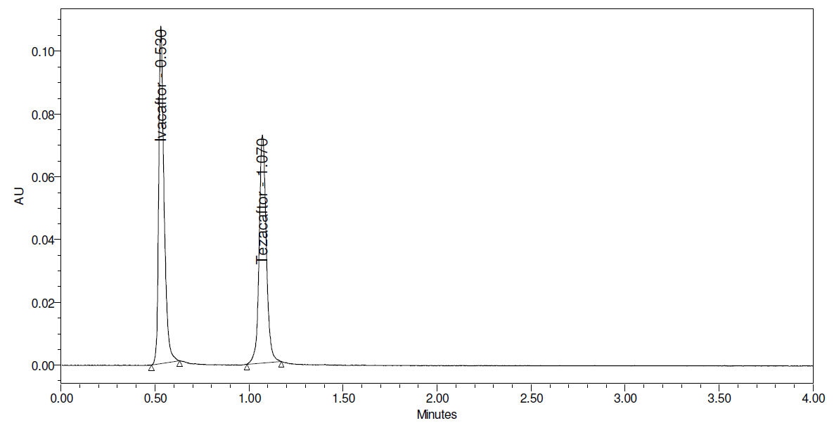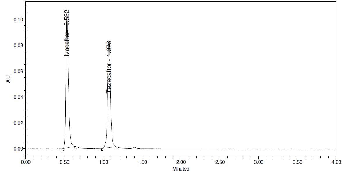 Results: The retaining time for tezacaftor and ivacaftor were achieved at 1.071 min and 0.530 min, respectively. Tezacaftor, ivacaftor and their combined drug formulation were exposed to thermal, acidic, oxidative, photolytic, and alkaline conditions. The developed method was highly sensitive, rapid, precise and accurate than the earlier reported methods. The total run time was decreased to 2.0 min; hence, the technique was more precise and economical. Stability studies directed for the suitability of the technique for degradation studies of tezacaftor and ivacaftor.