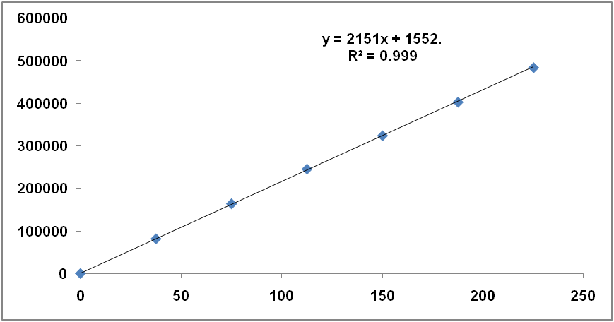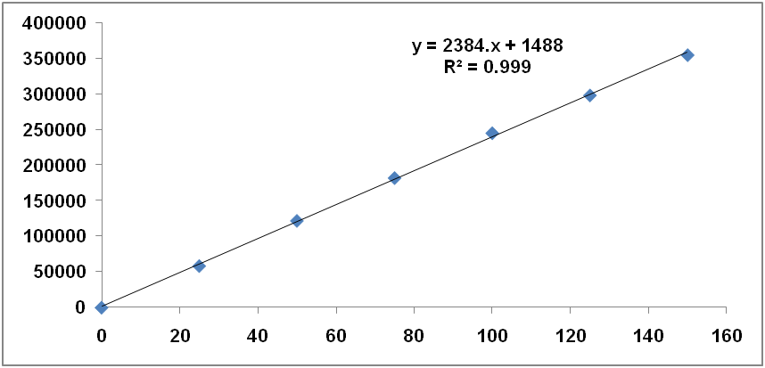 Aliquots of 0.25, 0.50, 0.75, 1.0, 1.25, and 1.50 ml of standard stock solution were pipetted out from the standard stock solution of concentration 1000 µg/ml of TZR and 1500 µg/ml of IVR and made up to 10.0 ml mark with diluent. The resulting solutions were come into 25 to 150 µg/ml of TZR and 37.5 to 225 µg/ml of IVR concentration range. The resulting linearity solutions were infused into a chromatographic system and form the chromatograms linearity graph was plotted by taking the peak area on Y-axis and concentration on X-axis. The calibration graphs were shown in fig. 3, 4 and table 1, and all findings were within limits.