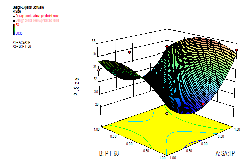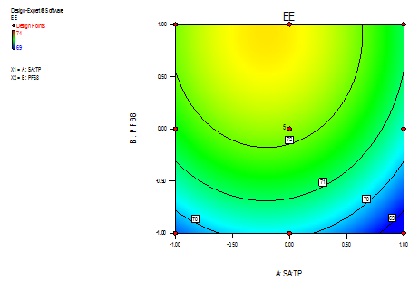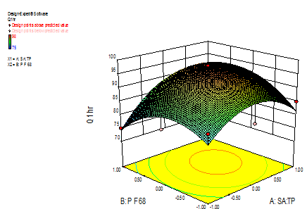 All the quadratic equations were found to be statistically significant (P<0.01), using ANOVA. Fig. 1A to 3A portray the 3-dimensional response surface plots, while fig. 1B to 3B are the corresponding contour plots for the studied response proper-ties like release in 1 hour, particle size and Entrapment efficiency. The fig 1A and 1B shows a region of maximum with the value 95 for release rate at 1 hour and higher values of A and B shows the trend of linearity. Fig. 2A and 2B depict in a non-linearity manner, but in an ascending pattern with an increase in the ratio of stearic acid and tripalmitin as well as also for the amount of pluronicF-68. From the 3D response curve, it can be observed that if the ratio of lipids increased then the tendency of particle size of the formulation is also in increasing pattern. Fig. 3A and 3B show that at the lower level of mixing the linearity is found. The general trend of the curve shows a descending pattern. pluronic F-68 has a greater effect on the entrapment efficiency. The higher values show the tendency of maximum entrapment.