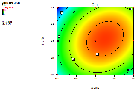 Where, ß0 is the intercept representing the arithmetic average of all quantitative outcomes of 13 runs; ß1to ß7 are the coefficients computed from the observed experimental values of Y; and X1and X2 are the coded levels of the independent variable, the terms X1X2 and Xi2 (i = 1 to 2) represent the interaction and quadratic terms, respectively. 3-D response surface graphs and 2-D contour plots were constructed in MS-Excel environment using the output files generated by the Design Expert software.