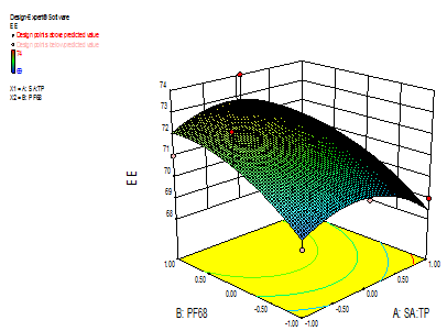 Entrapment efficiency = 72.21-0.50A+1.33B+0.00AB-1.22A2-0.72B2... (3)