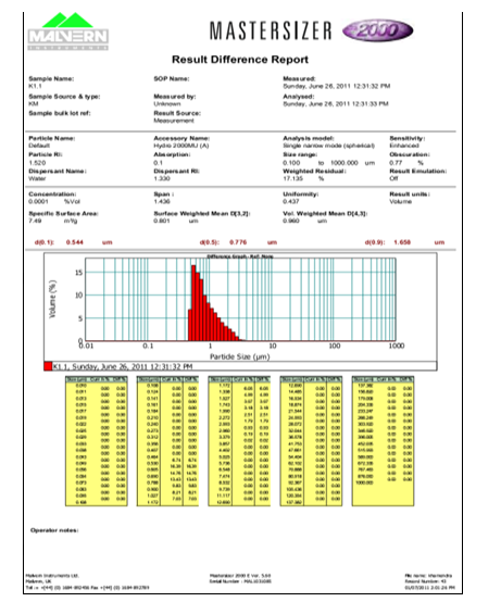 Particle size distribution of etoricoxib loaded SLN was studied by Mastersizer 2000 (Malvern Instruments Ltd, Worcestershire, UK). Particle size distribution was evaluated by using the volume distribution (d10%, d50%, d90%). Uniformity of distribution of nanoparticles was evaluated by span, by using the following equation.