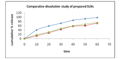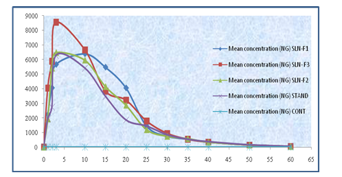 After thorough study of pharmacokinetics, it was observed that formulation SLN-F3 have a great enhancement in Cmax value of 8558.134 when compared with standard 6274.290 and also with respect to other formulation. The value of AUC is found also higher in the case of formulation SLN-F3 (21317.995µg h/ml) than compared to standard (15677.336 µg h/ml). Volume of distribution is also found remarkably higher for formulation SLN-F3 when it compared with other formulations or with standard.