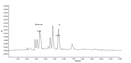 Chromatographic conditions for all studies were mentioned in table No 7 and chromatogram obtained for the rat plasma blank and then rat plasma with internal standard, shown in fig. 13&14.