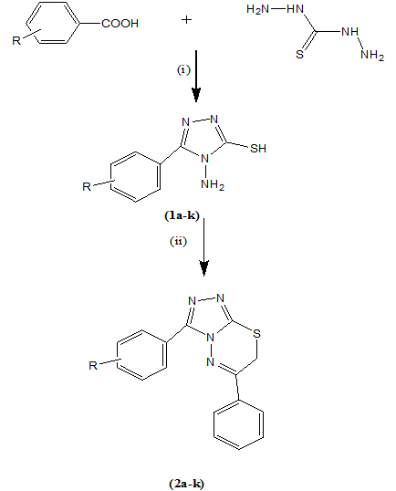 In the present work, a mixture of substituted benzoic acid and thiocarbohydrazide were heated until the contents were melted and the mixture was maintained at this temperature for 15-20 minutes to obtained 4-amino-3-(substituted phenyl)-5-mercapto-1, 2, 4-trizole (1a-k). The synthesized intermediates (1a-k) were refluxed with 2-bromoacetophenone in ethanol to yield 3-substituted phenyl-6-phenyl-7H-[1, 2, 4] triazolo [3, 4-b][1,3,4] thiadiazine (2a-k).