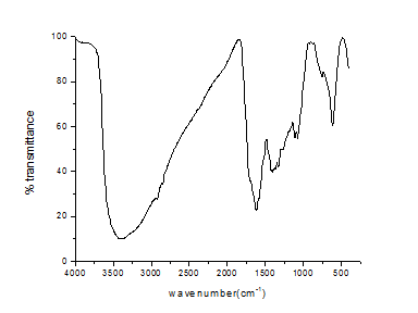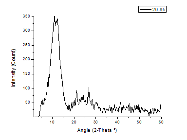 The XRD pattern of iron oxide nanoparticle is given in fig. 1. The crystallinity of the iron nanoparticle was examined by XRD and the distinct peak of Fe2O3 was found at 26.85 (2θ), accounting for crystal plane (211) and intense peak at 2h = 11.052 was identified as polyphenols. Both iron oxide and iron oxohydroxide were observed in the iron nanoparticles synthesized by Simarouba glauca bark extract and are amorphous in nature [19].