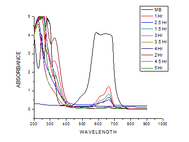 Photocatalytic activity of the iron oxide nanoparticle synthesized using Simarouba glauca aqueous bark extract was evaluated by the decolorization of methylene blue dye in aqueous solution. The experiment was carried out in the presence of visible light irradiation without any catalyst. 10 mg of methylene blue dye was added to 1000 ml of double-distilled water used as stock solution and 10 mg of iron oxide nanoparticles was added to 100 ml of methylene blue dye solution. A control was also maintained without the addition of iron oxide nanoparticles. The reaction suspension was well mixed by stirring for 30 min to make the equilibrium of the working solution. The dispersion was then put under the sunlight and 10 ml of the solution was withdrawn at 30 min time interval to evaluate the photocatalytic degradation of the dye. The solution was centrifuged for 1 min and filtered to remove the iron oxide catalyst particles before measuring the absorbance. That was characterized by UV-Visible spectroscopy [26].