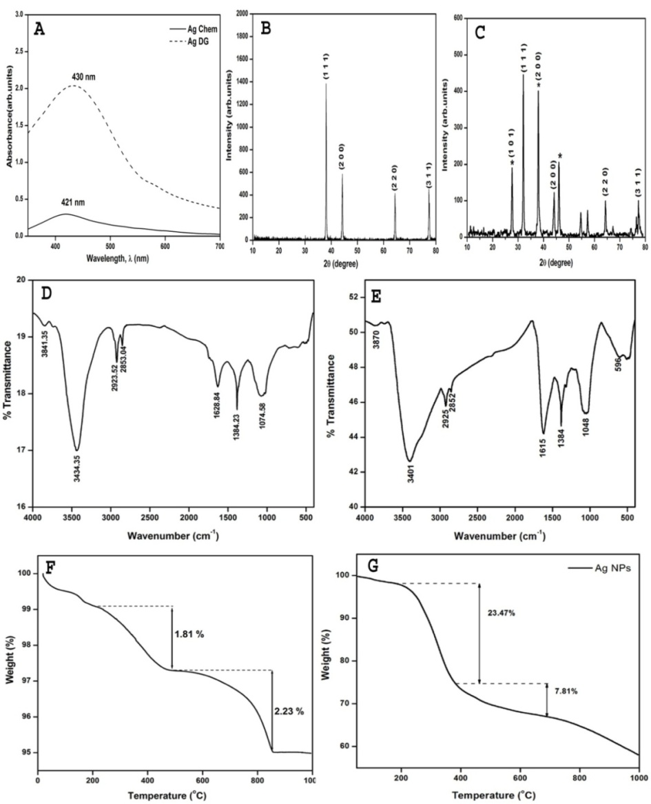 Fig. 1: Characterization of silver nanoparticles A) UV-Visible Spectra, B) XRD pattern of chemAgNPs, C) XRDpattern of DG Ag NPs, D) FTIR Spectrum of, E) FTIR Spectrum of DG Ag NPs, F) TGA pattern of chem Ag NPs and G) TGA pattern of DG AgNPs