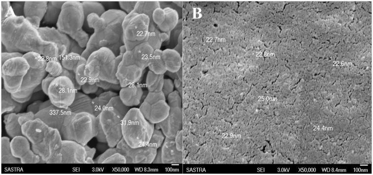 The SEM analysis was used to evaluate morphology of both chemical and DG synthesized silver nanoparticles. Fig.2 clearly shows the presence of spherical shaped particles. Part A shows strong aggregation of chemically synthesized nanoparticles in granulate resulting in large, irregular sized particles compared to the green synthesized AgNPs (part B) which might happened due to the lack of stabilizing agent. Also the presence of varying sized particles was observed in case of chemical AgNPs, whereas monodispersed nature of particles was observed in case of green AgNPs (correlates with Zeta analysis which shows PDI of 0.3). Observed nanoparticles were in the range of 30 – 300 nm in diameter for chemical AgNPs and 20 – 25 nm in case of green AgNPs.