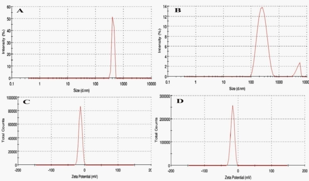 Fig. 3: Zeta potential analysis A) Size distribution of chemical AgNPs; B) Size distribution of green AgNPs; C) Potential distribution of chemical AgNPs; D) Potential distribution of green AgNPs