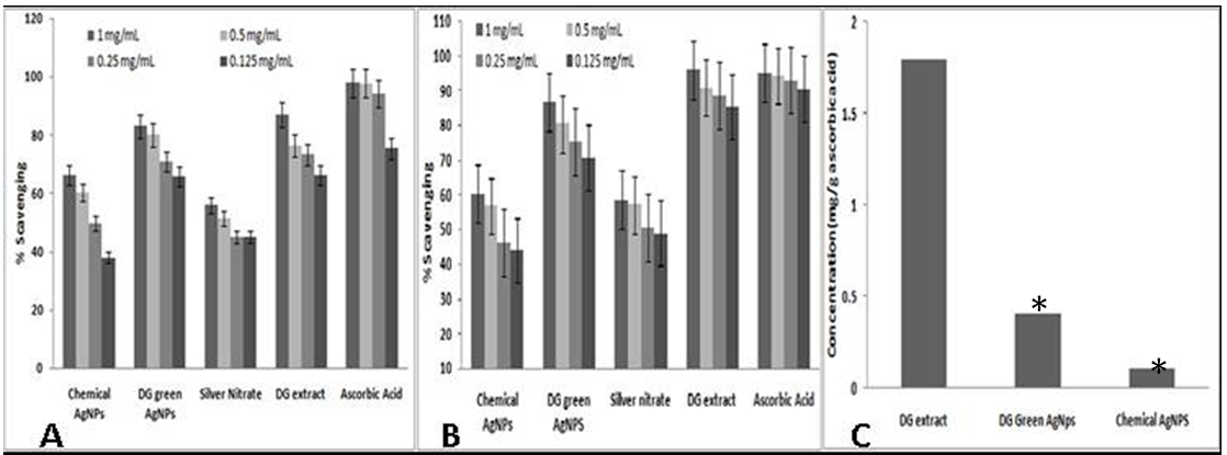 Various studies have shown that nanoparticles like fullerenes, carbon nanotubes, emission particles etc., can trigger free radical formation [32]. These radicals can directly develop on the surface of the particles. Assumingly, metal oxide nanoparticles can act as catalyst in the generation of reactive oxygen species. In the present study we used DPPH radical and superoxide radical to assess the scavenging potential of AgNPs (fig. 4A and B). Both DPPH and superoxide radical generated by in vitro method was effectively scavenged by AgNPs prepared by DG aqueous root extract as compared to chemically synthesized route. This difference in their biological activity may be attributed to some special functional groups (identified by FTIR) associated with AgNPs developed by green route. DG root extract is well known for its antioxidant potential and its phytocompounds not only can act as reducing agent for the synthesis of the particles but also act as a stabilizing agent and augment the physical properties suitable for biological applications.