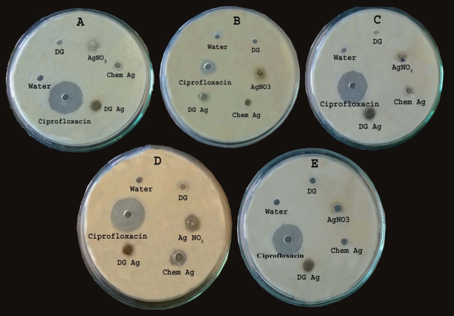 Well diffusion method [23] was used to check the antimicrobial activity of silver nanoparticles. 25 mL of molten and cooled Mueller Hinton agar were poured in sterilized petri dishes. The plates were left overnight at room temperature to check for any contamination. All the bacterial test organisms were grown in Mueller Hinton broth for 24 hours. The 100 µl nutrient broth culture of each bacterial organism was used to prepare bacterial lawns in petri dishes. Agar wells (8 mm) were prepared with the help of a sterilized stainless steel cork borer. The wells in each plate were loaded with 100 μl of silver nanoparticles, along with the precursor (AgNO3) and DG extract. The inoculated plates were incubated overnight at 37 °C and checked for antimicrobial activity. Ciprofloxacin was used as standard and water as negative control.