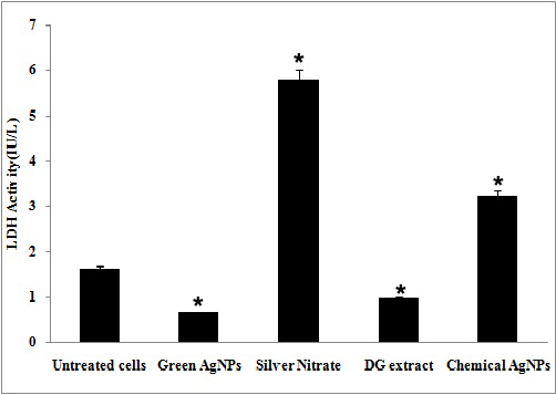 Silver nanoparticles, one of the man-made nanoparticles, widely used in commercial medical and consumer products is not devoid of toxicity issue. There is no confirmed evidence to show the AgNPs themselves exert particle specific toxicity. In the light of these observations, we made a comparative evaluation towards the toxic nature of silver nanoparticles prepared by both green and chemical routes through LDH activity. Our results show less toxic potential of AgNPs prepared by green route (fig. 6). The phytocompounds on the surface of the green Ag nanoparticles augments the stability resulting in less damage to the cells. Evidences from previous studies indicate that regardless of their physical parameters viz., shape, size, etc., AgNPs exhibits their toxicity which depends on the concentration of the released silver ion under aerobic condition. Hence the low toxicity of biologically synthesized nanoparticles may be due to the controlled release of Ag+through controlling the oxygen availability [34].