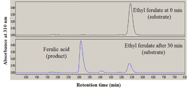Ethyl ferulate was used as a standard substrate for determination of FAEactivity. Ethyl ferulate (substrate) was dissolved in the minimum volume of 100% ethanol followed by the dilution with sodium phosphate buffer (50 mM, pH 6) up to 6 mM concentration. The reaction mixture was prepared by mixing 0.1 ml of substrate solution and 0.5 ml of crude enzyme extract and incubated at 37°C water bath for 30 min. The reaction was terminated by boiling the reaction mixture at 100°C for 10 min followed by filteration through 0.2µm filter, respective released FA concentration was quantified by HPLC (Waters, Milford, MA, USA) equipped with RP18 column (XTerra, RP18 5µm, 4.6×150 mm Column). The sample size was 20µl and the FA (product) and ethyl ferulate (substrate) were eluted in an isocratic solvent system of mili Q water and 100% methanol in the ratio 40:60 as the mobile phase at a flow rate of 1 ml/min for 8 min and monitored at 310 nm. One unit of FAEwas defined as the amount of enzyme required for release of 1µmole of FA per minute.