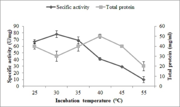 Initially temperature and pH conditions were optimized. Based on the initial studies, the temperature conditions needed for enzyme production by Mucor hiemalis was observed in the range of 25°C to 55°C, with an optimum enzyme production of 78 U/mg noticed at temperature 30°C (figure 2) similar to Fusarium proliferatum (23). Enzyme showed 80% enzyme production in the range of 30°C to 35°C; however, above 35°C and below 30°C, a decrease in enzyme activity was observed.