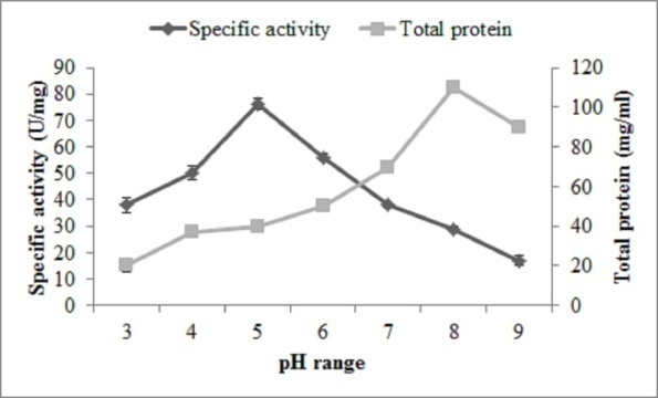 Maximum enzyme production (76 U/mg) was demonstrated at optimum pH 5 (figure 3), corroborates with an earlier study on FAE production from Aspergillus niger strain CFR 1105 (24). Furthermore, It was observed that the enzyme production was very good in the range of 5.0 to 7.0; however, the enzyme reduced drastically at pH value less than 5.0 and more than 7.0