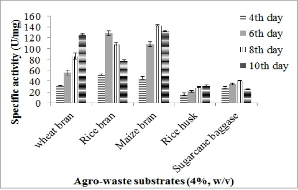 Among the different agricultural waste residues screened, it was noticed that all the agricultural waste supported the FAE secretion by the fungus. Maize bran was identified as a most suitable substrate for FAE production of 143 U/mg (8 days incubation) followed by rice bran 129 U/mg (6 days incubation), a further increase in the fermentation time resulted in a decrease in the enzyme production (figure 4). Earlier it was reported that the complex carbon sources such as wheat bran and sugarcane baggase favored efficient microbial production of FAE (25)