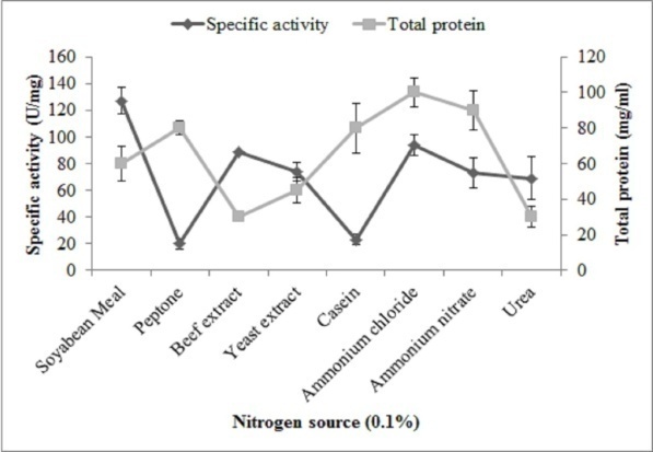 Fig. 5: Effects of nitrogen sources on ferulic acid esterase production by Mucor hiemalis NCIM 837