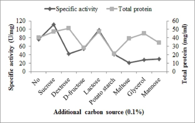 Nitrogen and carbon sources are essential elements of the enzyme production medium and play an important role in the fungal growth and metabolism. In earlier studies, it was reported that complex organic nitrogen sources like peptone did not support FAE production (26), fortifies this study as Mucor hiemalis did not support FAE production in presence of peptone as nitrogen source. Among the nitrogen sources tested that favored the enzyme production from Mucor hiemalis NCIM837, soyabean meal (127 U/mg) was observed as the most effective, followed by ammonium chloride (94 U/mg) and beef extract (89 U/mg) (figure 5). Aspergillus terreus Strain GA2 showed maximum enzyme activity with potato starch followed by fructose and sucrose (27),whereas this study emphasize that M hiemalis showed maximum enzyme production with sucrose (112 U/mg) followed by lactose (98 U/mg) (Fig. 6).