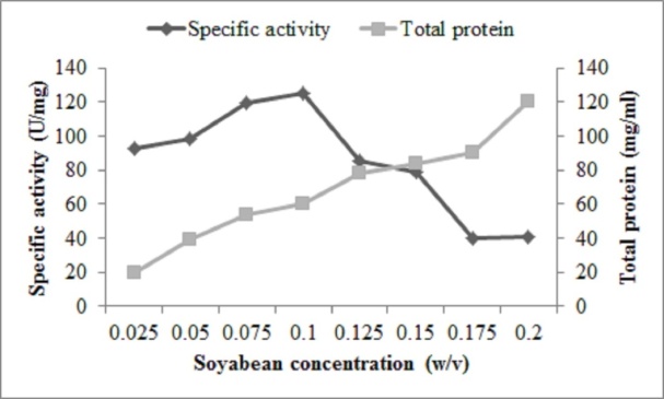 Furthermore when soyabean meal and sucrose were supplemented individually at various concentrations ranging from 0.025% to 0.2% (w/v) in the EPM along with 1% (v/v) ethyl ferulate (1%, w/v in DMF), the maximum enzyme production was observed on supplementation of 0.1 % (w/v) soyabean meal (figure 7) and 0.075% (w/v) sucrose (figure 8). The use of soyabean meal and sucrose aided in the biomass of Mucor hiemalis resulting FAE production was more rapidly than when grown in without sucrose and soyabean meal. Using this formulated medium, the maximum enzyme production observed was 172 U/mg after 8 days of incubation at 30°C. The overall enzyme production increased by 2.2 fold as compared the un-optimized conditions. This optimized medium can be further explored for commercial production of FAE.