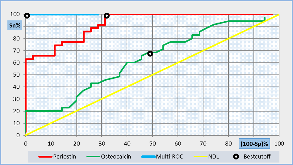 In the current work, there was a significant positive correlation between osteocalcin and periostin in group I and group II. However, the diagnostic performance of periostin and osteocalcin in discrimination between group I and group II using ROC curves revealed a more powerful discriminating capability of periostin than osteocalcin. The best cutoff value of periostin was taken at 850 ng/ml with specificity and sensitivity (100 % and 68.6 %), respectively, while the best cutoff value of osteocalcin was taken at 26.2 ng/ml with specificity and sensitivity (68.6 % and 51.4 %) respectively. Moreover, a multi ROC curve was performed for periostin and osteocalcin together and revealed improved specificity and sensitivity of 100 % for each at the cut off values (850 and 32.5), respectively.