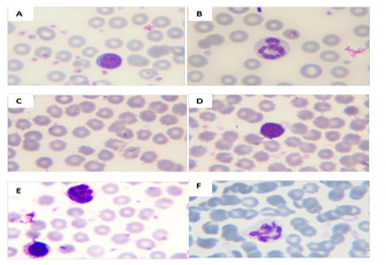 Lymphocytes and monocytes presented an irregular nucleus with a scattering chromatin, as shown in (Fig.1D,E). PMNs were defined by hyper segmentation of nucleus compared with those in control smear (Fig. 1F).