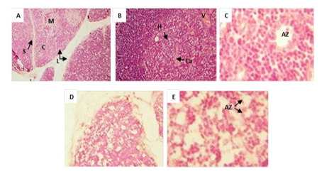 Fig. 2: Histopathological changes in the thymus of control group and methionine supplementation. (H&E). Thymus of control rat (A, 40x), showing several lobules (L) delimited by a connective tissue septum (S), and subdivided into cortex (C) and medulla (M). Theheavy staining of the cortex is due to the closely packed small lymphocytes. The medulla also contains lymphocytes, but these cells are spaced by larger cells that are lightly stained. Venules (V), capillaries (Ca) and Hassall’s, corpuscle are also identified(B, 100x). The apoptotic zone (AZ)is shown at a higher magnification (C, 400x). Thymus of Met rat showing involution in lobule (D, 40x) with remarkably decreased number of lymphocytes expressed by apoptotic zones (AZ) (E, 400x)