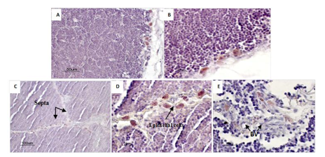 Fig. 3: Effect of methionine on VEGF expression (IHC, anti-VEGF-A, DAB). In control thymus (A, 100x),(B, 400x) positive VEGF expression in subcapsular of lobules. In Met thymus, positive epithelial cells for VEGF in septa (C, 40x), endothelial cells positive for VEGF in a septum (D, 400x) and positive blood vessels (BV) for VEGF at the corticomudullary junction (E, 400x)