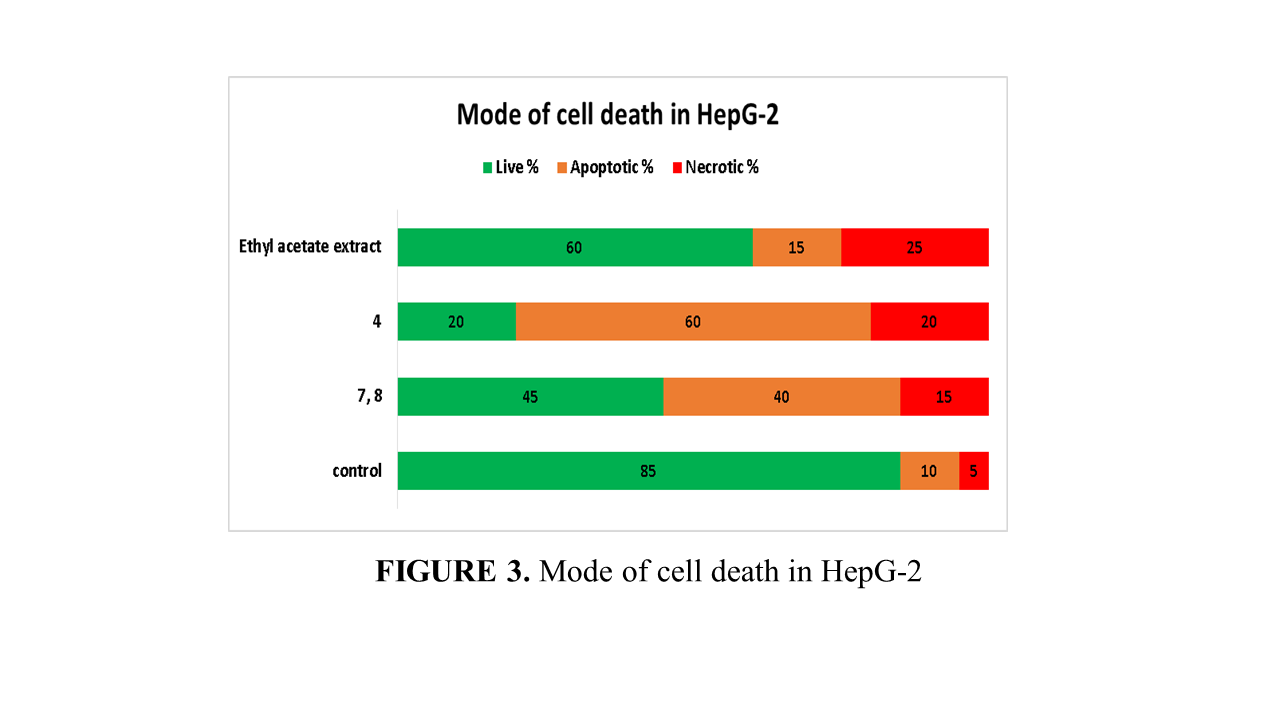 Compound 4 and the mixture of 7 and 8 did not manifest necrotic and apoptotic cell death in the case of MCF-7 (10-35%) (fig. 2) while in the case of Hep G2, compound 4 caused apoptotic and necrotic cell death with 60 and 20 % respectively while in case of a mixture of 7 and 8 being 40 and 15(fig. 2). This finding suggests that the decrease in the number of Hep G2 cells using these compounds was due to apoptotic and necrotic processes.