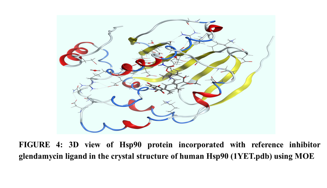 Fig. 4: 3D view of Hsp90 protein incorporated with reference inhibitor geldanamycin ligand in the crystal structure of human Hsp 90 (1YET. pdb) using MOE