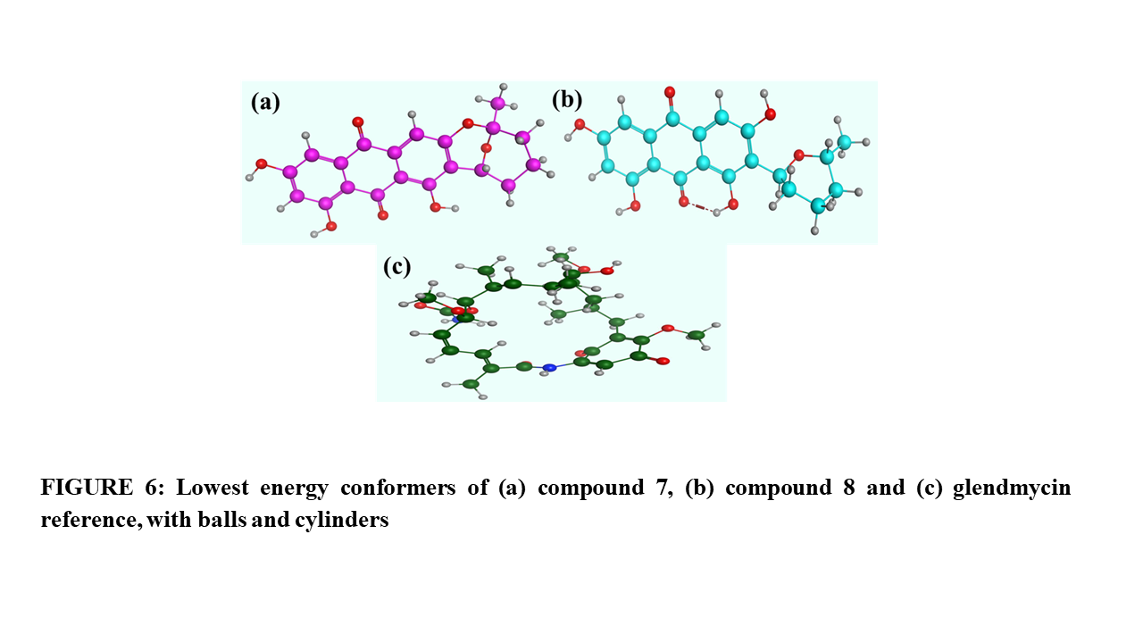 Fig. 6: Lowest energy conformers of (a) compound 7, (b) compound 8 and (c) geldanamycin reference, with balls and cylinders