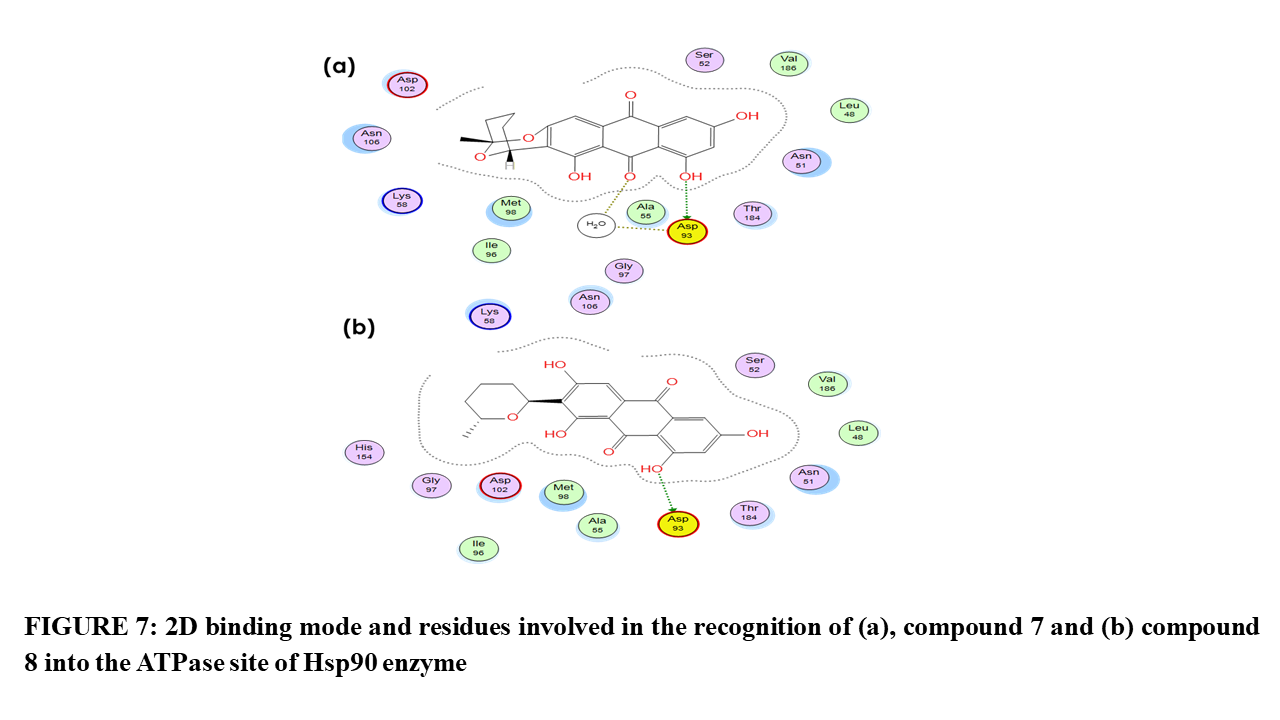 Fig. 7: 2D binding mode and residues involved in recognition of (a), compound 7 and (b) compound 8 into the ATPase site of Hsp 90 enzyme