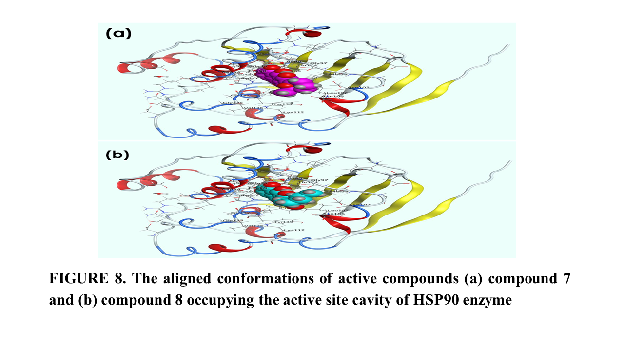 Fig. 8: The aligned conformations of active compounds (a) compound 7 and (b) compound 8 occupying the active site cavity of Hsp 90 enzyme