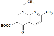 Nalidixic acid (fig. 2) chemically is 1-ethyl-1,4-dihydro-7-methyl-4-oxo-1,8-naphthyridine-3-carboxylic acid. It is a synthetic quinolone antibiotic effective against both gram-positive and gram-negative bacteria. At lower concentrations, it acts as a bacteriostatic and at higher concentrations; it is bactericidal [4]. Nalidixic acid is an inhibitor of the A subunit of bacterial DNA gyrase. Nalidixic acid is indicated for the treatment of urinary tract infections caused by susceptible gram-negative microorganisms, including the majority of E. Coli, Enterobacter species, Klebsiella species, and Proteus species. It works by killing the bacteria and preventing their growth tract by stopping the production of essential proteins needed by the bacteria to survive. It has a molecular formula of C12H12N2O3 and a molecular weight of 232.235 g/mol.