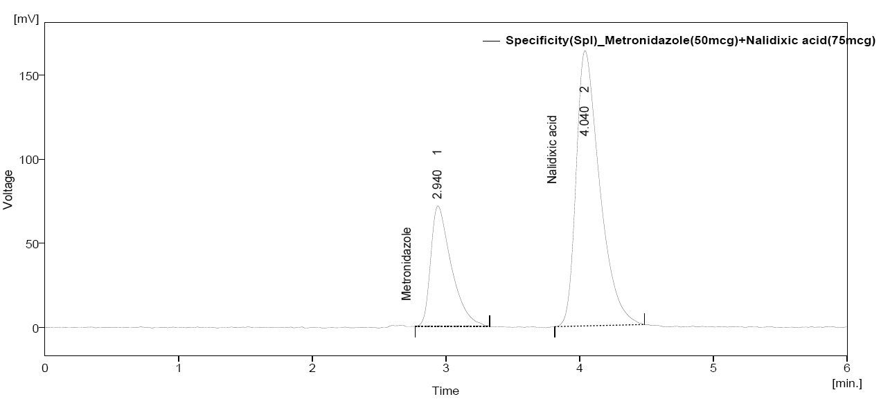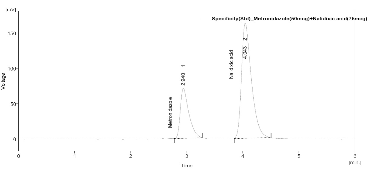 Results: The developed method resulted in Metronidazole eluting at 2.92 min and Nalidixic acid at 3.99 min. Metronidazole exhibited linearity in the range 30-70μg/ml, while Nalidixic acid exhibited linearity in the range 45-105μg/ml. The precision is exemplified by relative standard deviations of 0.714% for Metronidazole and 0.398% for Nalidixic acid. Percentage Mean recoveries were found to be in the range of 98‐102, during accuracy studies. The limit of detection (LOD) for Metronidazole and Nalidixic acid were found to be 2.48µg/ml and 2.24µg/ml respectively, while limit of quantitiation (LOQ) for Metronidazole and Nalidixic acid were found to be 7.51µg/ml and 6.79µg/ml respectively.