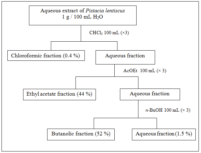 With the aim of separating the constituents of the aqueous extract, the lyophilized extract was partitioned by using three organic solvents of increasing polarities: chloroform (CHCl3), ethyl acetate (AcOEt) and n-butanol(n-BuOH) fig. 1.