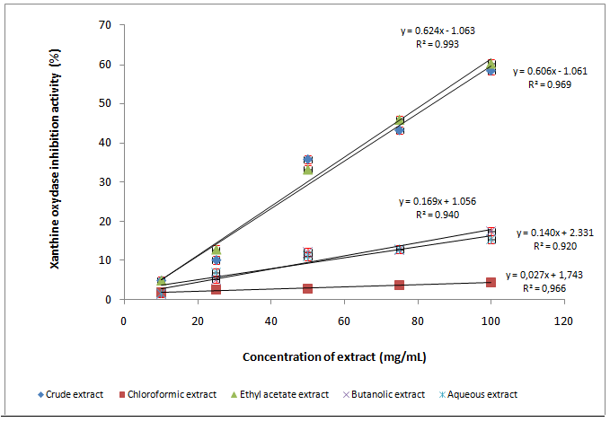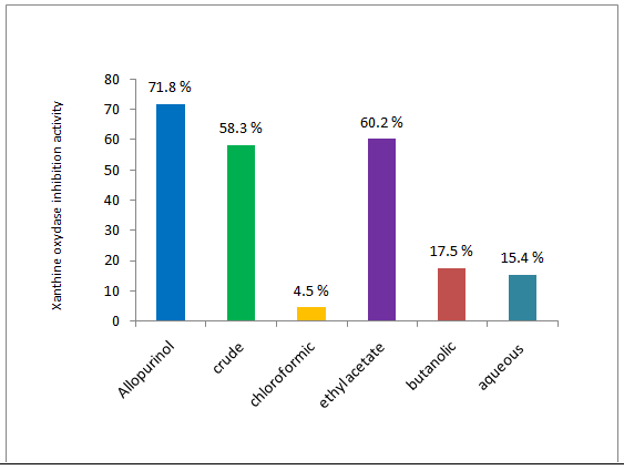 The crude and ethyl acetate extracts were found to have XO inhibitory activity reaching more than 50 % at a concentration of 100 mg/mL. The highest XO inhibitors activity was the ethyl acetate fraction with 60.2 % (IC50 = 2.50 mg/mL), the crude with 55.3 % (IC50= 2.57 mg/mL), butanolic 17.5 %, aqueous 15.4 % and chloroformic 4.5 %.