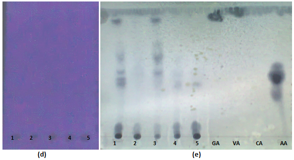 1: crude extract, 2: chloroformic fraction, 3: ethyl acetate fraction, 4: butanolic fraction, 5: aqueous fraction Samples of phenolic acids: GA: gallic acid, VA, vanilic acid, CA: cinnamic acid, AA: ascorbic acid