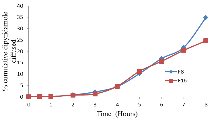 Fig. 1: Percentage of dipyridamole diffused through film F8 and and F16