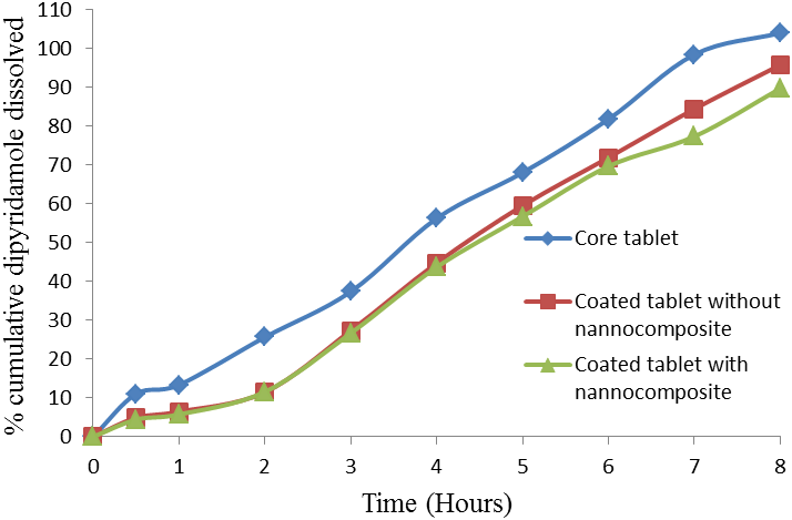 It was found that the formulation without nano-composite which consisted of Eudragit® RS / RL 30D in a ratio of 80:20 and 20 % PEG 600 (w/w dry polymer) gave 44.76±4.74 % of release at 4th hour and 95.76±1.35 % at 8th hour. While the formulation with nano composite of 2% along with the polymer dispersion gave 43.59±3.59 % release at 4th hour and 89.69±4.92 % of release at 8th hour. Release studies of dipyridamole coated floating tablets showed that both coated layer gave release upon the requirement that needed for a sustained-release dipyridamole floating tablet. The result dissolution complied with the zero order release and was similar to the release order calculated during the determination of the requirement.