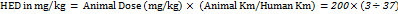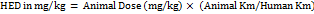The dose is equally related to bodyweight although it is not the lone factor that influences the scaling for dose calculation. The correction factor (Km) is estimated by dividing the average body weight (kg) of species to its body surface area (m2). The Km factor value of various animal species is used to estimate the Human Equivalent Dose (HED) as: